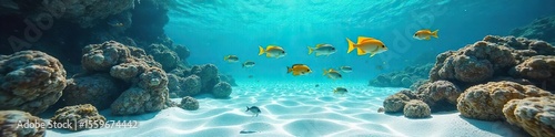 © Nannapin, Fototapeta premium Tropical Fish Swim in Crystal Clear Water, Pristine White Sand Beach, Underwater Paradise Scene. Perfect for Travel, Vacation, and Nature Stock Photography. Serenity and Beauty.