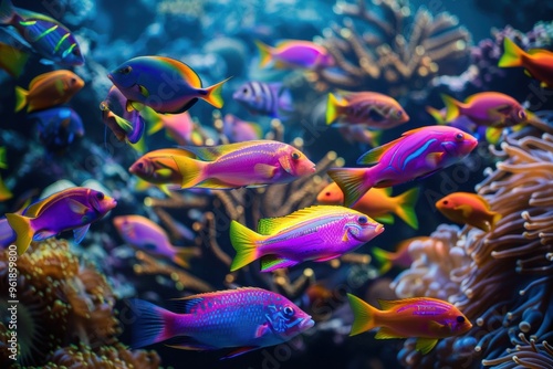 © Surachetsh, Naklejka premium tropical fish swimming among vibrant corals, with a scuba diver observing the underwater beauty. Ideal for marine conservation campaigns and educational exhibits.