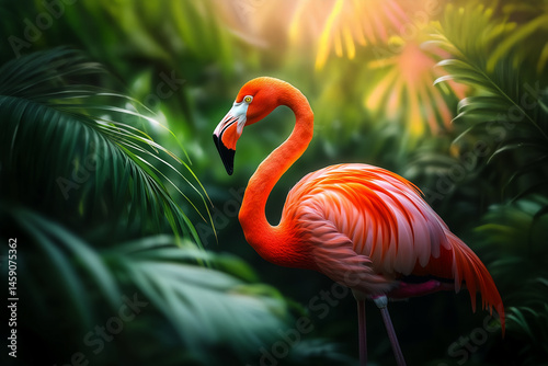 Fototapeta premium Tropical Flamingo in Lush Greenery, Sunlit Jungle Scene