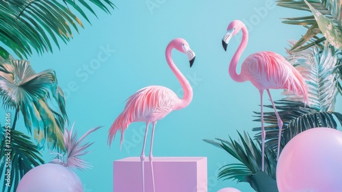 © JuanB, Fototapeta premium Tropical flamingos with pastel props and greenery