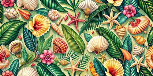 Naklejka premium Tropical Flora and Fauna in a Whimsical Tapestry of Lush Green Foliage, Exquisite Shells, and Intricate Starfish