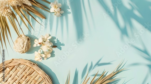 © Adobe Contributor, Obraz premium Tropical Floral Flatlay with Blue Background