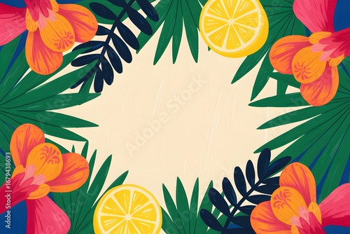 Naklejka premium Tropical Floral Frame: An eye-catching floral frame showcasing bright hibiscus blooms, vibrant green foliage, and juicy lemon slices, perfect for adding a touch of tropical freshness.