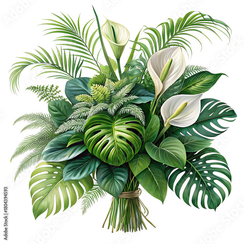 Fototapeta premium Tropical flower bouquet with calla lilies and monstera leaves isolated on...
