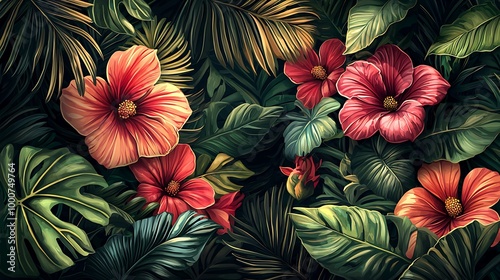 © theerachai, Naklejka premium Tropical Flowers and Leaves Pattern Background