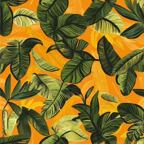 © Karina Korytchenko, Obraz premium Tropical foliage pattern with detailed monstera leaves on vibrant orange background
