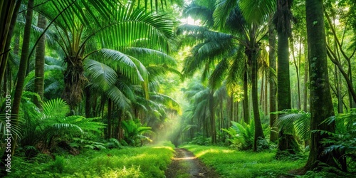 Fototapeta premium Tropical forest background with leading lines of green nature leaves