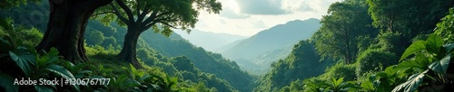 © methinee, Fototapeta premium Tropical forest on a hill with giant trees and vines, lush, tropical