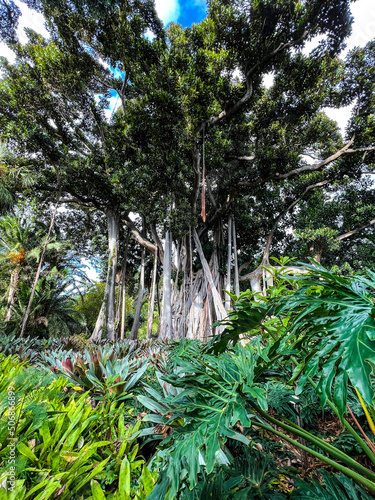 Fototapeta premium Tropical forest with moss, tourist path through the jungle. Rainforest. Canary Islands. Tenerife.