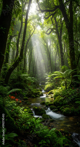 © Yusup, Fototapeta premium Tropical forest with sunlit stream water.