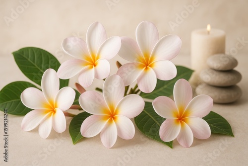 Fototapeta premium Tropical frangipani flowers arranged in spa-inspired wellness composition