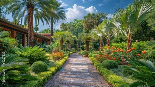 Obraz premium Tropical Garden Pathway With Palm Trees