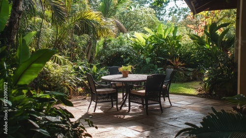 © Togrul, Obraz premium Tropical garden patio with table, chairs