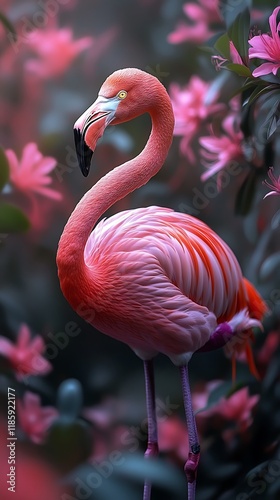 © saikat, Fototapeta premium Tropical garden with flamingo surrounded by pink flowers high resolution hd picture