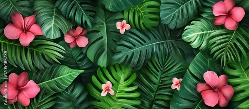 © indirah, Fototapeta premium Tropical Green Leaves and Pink Flowers Lush Jungle Background