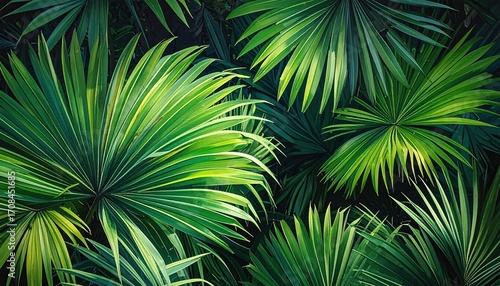 © Ayuni, Obraz premium Tropical Green Palm Leaves Texture in High Detail Botanical Pattern Dark Background