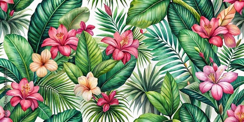 © A.Rod, Naklejka premium Tropical Hawaiian seamless pattern with palm leaves, rhododendron flowers, and watercolor botanical elements, Hawaii