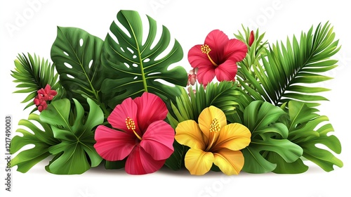 Obraz premium Tropical hibiscus flowers, lush foliage, white background, design element