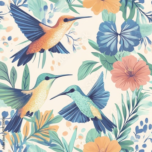 © keke, Fototapeta premium Tropical Hummingbirds and Leaves Seamless Pattern Flat Design