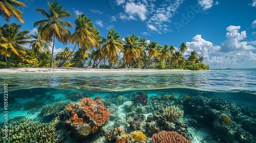 Naklejka premium Tropical Island Beach with Palm Trees, White Sand and Clear Waters