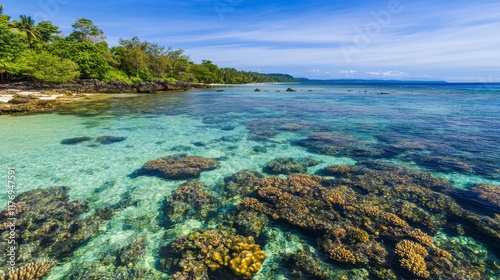 Fototapeta premium Tropical Island Coastal Paradise: Pristine Coral Reefs and Crystal Clear Waters