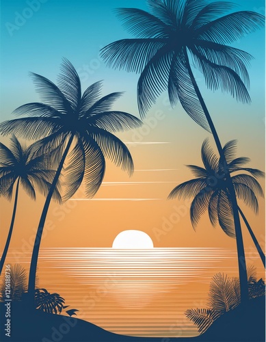 © Rindi, Obraz premium Tropical island paradise background with palms silhouette and sky. Generated image