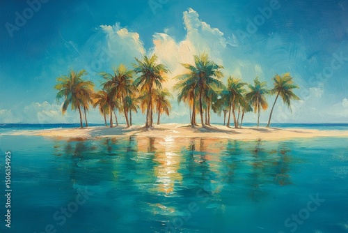 © Imam, Naklejka premium Tropical island paradise sunset; calm ocean, palm trees