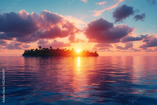 © Diki prayoga, Fototapeta premium Tropical Island Sunset Over Calm Ocean Waters