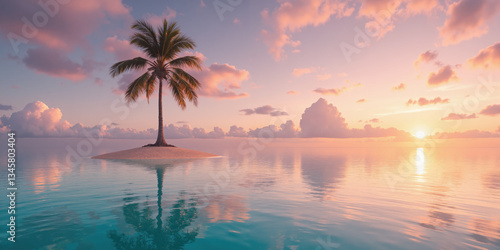 Fototapeta premium Tropical island with a single palm tree at sunset for paradise and relaxation visuals. A small tropical island features a single palm tree