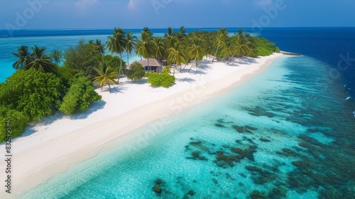 Obraz premium Tropical island with luxury beach resorts, vibrant coral reefs and lush greenery