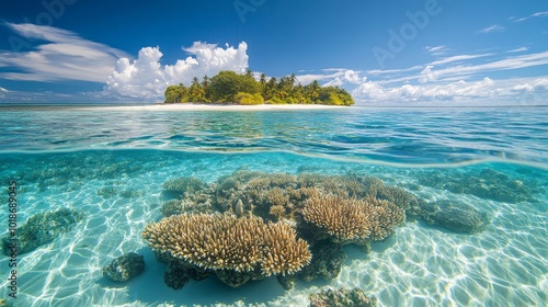 Naklejka premium Tropical Island with Underwater Coral Reef View
