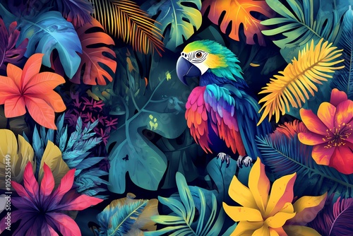 © PixelNest, Fototapeta premium Tropical Jungle Bird and Colorful Flowers
