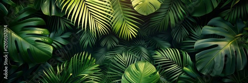 Fototapeta premium Tropical jungle green leaves background with dark forest and sunlight