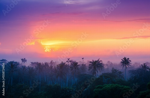 Obraz premium tropical jungle landscape during sunset, featuring tall silhouetted palm...
