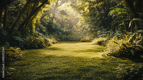 Fototapeta premium Tropical jungle scene with dense greenery in the background, soft sunlight filtering through leaves, and a large open space in the foreground.