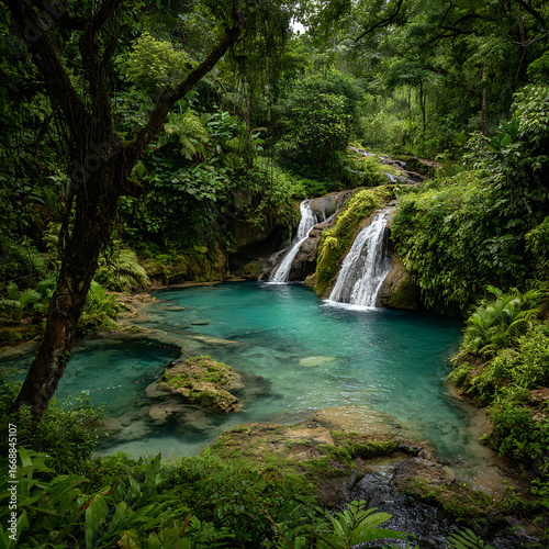 © Faiza, Fototapeta premium Tropical Jungle Waterfall with Turquoise Lagoon