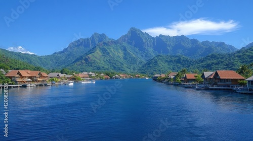 © irawan710, Fototapeta premium Tropical lagoon houses, mountain backdrop, sunny day, travel brochure
