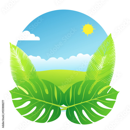 Obraz premium Tropical Landscape with Palm Leaves and Summer Sun - Vector Illustration