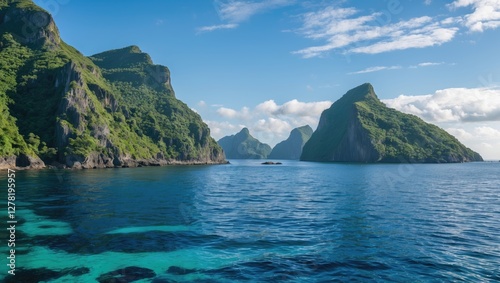 © The 2R Artificiality, Obraz premium Tropical landscape with rocky mountains and clear blue water under a sunny sky in a scenic coastal environment