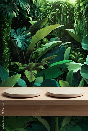 © Ylstudiobd, Obraz premium Tropical leaf background with two display platforms