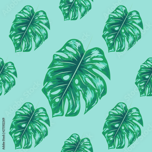 © MichiruKayo, Fototapeta premium Tropical leaf design featuring blue Monstera plant leaves. Seamless repeating pattern.