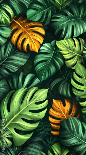 © ak159715, Naklejka premium Tropical Leaf Seamless Pattern. Line Art Style. with green background