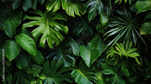 © almeera, Fototapeta premium Tropical Leaf Wall: A Lush Green Tapestry