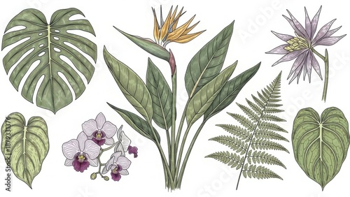 © StNurliah, Obraz premium Tropical Leaves and Flowers Botanical Illustration.