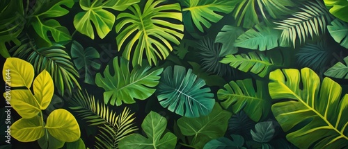 Naklejka premium Tropical leaves background full of exotic greenery for interior design, nature wallpaper, and eco-friendly decor showcasing vibrant plant life.