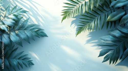 © medi, Fototapeta premium Tropical leaves cast soft shadows on a light blue surface.