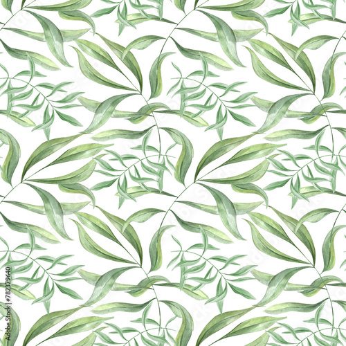 © Masha_tolk_art, Fototapeta premium Tropical leaves. Green oleander branches. Seamless pattern of olive leaves. Ivy realistic foliage. Watercolor illustration isolated on white background. Floral greenery design for package, textile