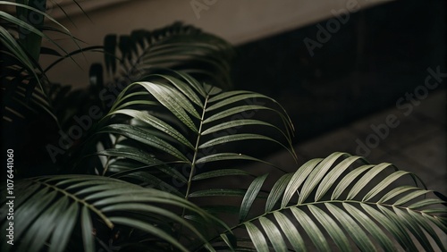 Fototapeta premium Tropical leaves in cosy interior, modern house interior
