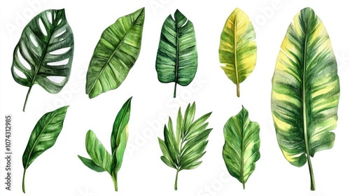 Fototapeta premium Tropical leaves in watercolor style Botanical illustration of a lush jungle...