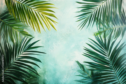 © Barno, Obraz premium Tropical leaves placed on a vibrant blue background, creating a striking contrast and a visually appealing aesthetic.